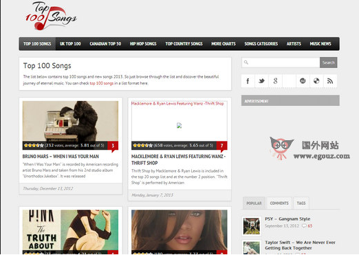 TheTop100Songs:100首经典英文歌曲排行是一个收录世界音乐排行榜的前100首歌曲推荐博客网站,包含英国音乐排行榜、Top Hip Hop Songs、Top Rock Songs等等。Top 100 Songs is a music chart blog website. It has cool features for music lovers to enjoy weekly updated music charts and exciting information about popular artists....