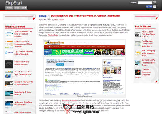 SlapStart:互联网初创产品评论网是一个致力于互联网产品推荐和评论的文章站点,介绍世界互联网中最新的产品、工具和服务,该网站之前只是业余爱好,原创一些幽默、批判性质的文章,之后开始提供专业的评论,对新发布的互联网产品进行专业的评论。Hello! And welcome to SlapStart. Many people know SlapStart for its witty reviews and insightful commentaries on upcoming start-ups. Most people dont know that Sla...