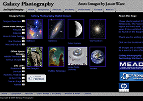 画廊摄影网(Galaxy Photography)是美国摄影师JasonWare的个人作品网站,主要展出其关于天文的摄影作品。1989年,JasonWare开始利用专门的米德仪器望远镜拍摄星空,他拍摄的图片也成为许多优秀影...