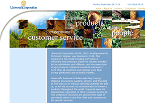 环球公司(Universal Corporation;简称:UN)是全世界最大的烟叶经营商,也是全球领先的农产品、木材及建材贸易公司,于1918年成立,业务包括贸易、加工、储存、分销、服务等;其产品包括烟叶...