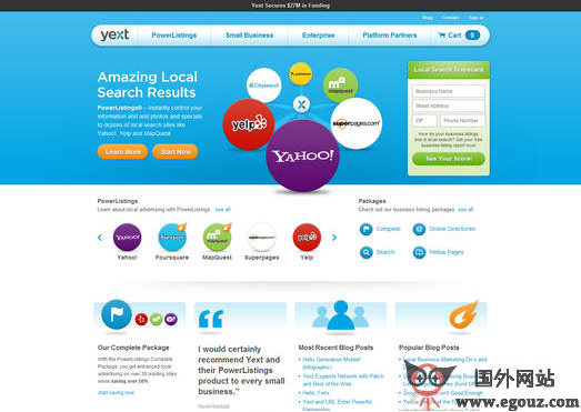 YexT:企业信息同步发布服务平台是一个帮助企业用户发布信息到各大知名网站和移动手机上的服务平台,,让用户在互联网上更容易找到当地的企业,获得企业最新产品信息,从而帮助企业扩大市场规模和影响力。通过独有的PowerListings功能帮助企业把企业最新的信息同步到各大知名信息网站和移动手机应用程序上,目前可以同步到Yahoo、Yelp、WhitePages等知名信息网站和Foursquare等社...