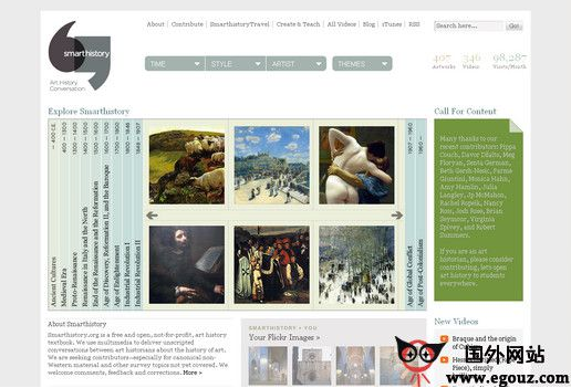 SmartHistory 是一个在线艺术史多媒体展播平台,可以按照时代、风格、艺术家等多种方式浏览艺术作品,许多作品还配有视频解说。网站本身也挺赞,还加了Flickr、Twitter等许多2.0的工具可以用。Smarthistory,可以理解为智慧的历史 – 一部人类艺术史的视频百科全书网站,从洞穴壁画到现代艺术无所不包。其特点是整个网站没有文字性的介绍,甚至没有插图,全部由视频内容组成。...