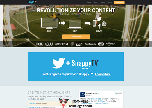 SnappyTV:在线短视频编辑平台是一家提供实时视频剪辑、编辑与分发的初创企业,该平台能够为电视直播创造第2屏幕的体验。SnappyTV的客户包括ABC新闻网、福克斯和福克斯体育台、NCAA、NASCAR、美国网球循环公开赛和大学生运动会等。用户在观看电视直播的同时,可以通过 PC 或移动终端进入该平台直接截取直播片段,然后在数秒钟之内发送给 Facebook 或者 Twitter 上的朋友和其一起分享...