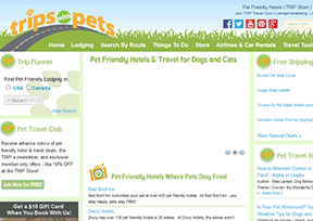 带着宠物旅行网(Tripswithpets.com)是美国著名的关于带宠物旅行的趣站,类似于 Pet Travel(宠物漫游) 。该网站主要为带宠物旅行的游客提供细致周到的服务,汇集了全美可带宠物旅游的酒店以...