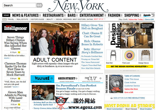 NYmag:美国纽约杂志是美国知名杂志之一,提供时尚、娱乐、新闻、人物等内容,NYMag的搜索引擎能搜索到这个城市每个角落的时尚和娱乐场所,提供的5000多个餐厅和酒吧的地址、电话。New York Magazine covers, analyzes, comments on, and defines the news, culture, entertainment, lifestyle, fashion, and personalities that drive New York City. New York Magazine, founded in April 1968, reaches 1.8 million readers each week and is published b...
