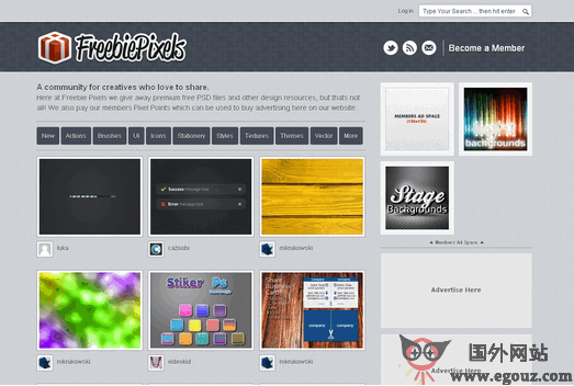Freebiepixels网站提供免费的PSD资源下载,同时还支持上传和分享,并赚取积分,用积分购买你想要的资源。下面是网站操作流程:1、创建图片分辨率:我们喜欢各种各样的图形的设计资源。不管它是图标,插图,刷或按钮,所有都是受欢迎的在这里免费像素。我们唯一要求是,你是唯一的创造者,你是快乐的资源是免费发放从网站在创作共用执照。如果这是一个对它的时间去Photoshop的压抑...
