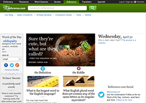 参考词典(Reference)是美国一款免费的在线词典,主要提供中文、英文、日文、韩文等20多种语言的互译服务,其内容包括英文定义、同义词、猜字谜、例句等各项功能。该网站语言有英文和西...