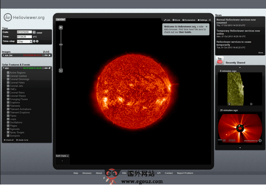 Helioviewer:开源太空景象模拟平台是一个免费开源的外太空项目,由美国NASAde SOHO卫星获取数据,模拟太阳和日光层图像的可视化工具,通过直观的界面和新颖的技术让用户了解外太空的神秘。Helioviewer项目是由欧洲航天局和美国航天局资助开发的,有兴趣的朋友可以进去看看,经常可以看到彗星撞太阳,或者巨星UFO之类的。当然也可以录像,在右上角有movie,选择时间就可以直接录...