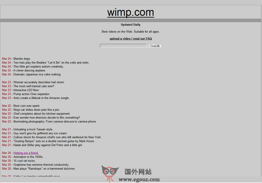 Wimp:互联网优秀视频分享网是专门从事视频分享的网站,虽然界面简单,但是凭借优秀的视频资源和优质访问速度,获得了很高的知名度,它会每天都更新一些视频的。适合于任何年龄的用户欣赏。Wimp是一个家庭友好的视频网站,提供各种视频:搞笑、教育、励志、可爱的、科学、新闻等丰富的视频资源,为生活增加更多了乐趣和快乐,该网站使用简单的方式来为不同年龄的用户...