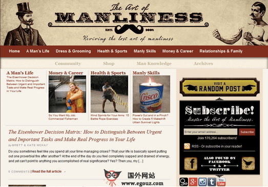 Artofmanliness:男人气质培养博客网是由一对夫妇创办的致力于帮助男人们如何做一位拥有男人气质,无论是生活中还是在社会上都能拥有良好的品质。The Art of Manliness 的创始人布雷特和凯特麦奎主要通过这个博客发表文章帮助男人成为更好的丈夫、父亲,在探索遗失的男子气概过程中展望过去找到范例与大家分享。The Art of Manliness希望读者可以从这些文章中受益匪浅,向有志者学习...