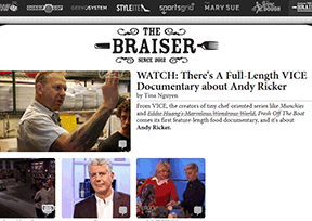 The Braiser是一个介绍名厨故事的网站,是由厨师迷Dan Abrams于2012年5月创建 的,主要介绍一些名人厨师背后的故事,以及厨艺比赛、厨师的生活方式和娱乐消遣等。The Braiser是一个专为厨师迷们打...