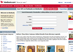 AbeBooks是美国著名的在线图书交易网站,于1996年在加拿大不列颠哥伦比亚省创建,主营新书、二手书、稀有书籍的交易。2008年8月1日,AbeBooks被亚马逊(Amazon)收购。...
