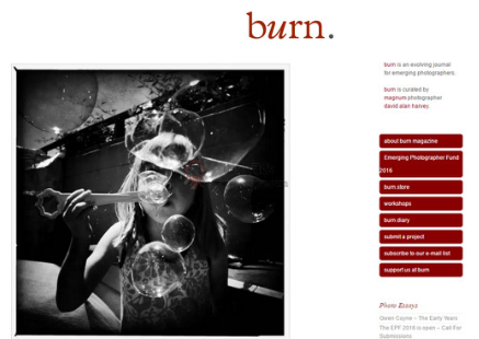 燃烧摄影杂志(Burn Magazine)是一个生活纪实类的摄影杂志站点,由马格南摄影师大卫·阿兰·哈维创办,首期杂志于2008年发布,此摄影站属于新兴摄影师类型,每周至少更新两次最新的摄影作品。...