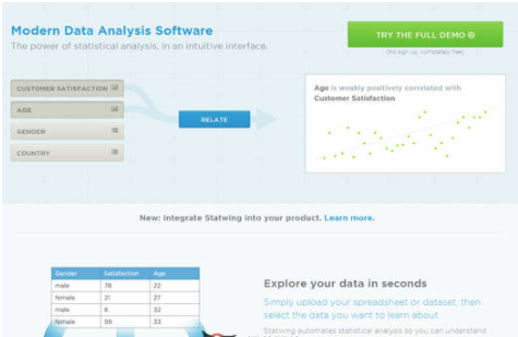 Statwing:在线产品统计分析工具是一个统计产品与服务解决方案的在线工具, 在使用体验上就像是图形界面对于命令行界面一样,非常简单易用。它让普通用户能以可视化操作就完成统计汇总和各种相关分析、假设检验,它还可将统计分析结果以通俗易懂的描述语言体现出来。...