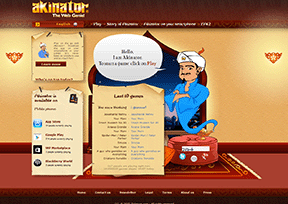 Akinator法国一个在线猜谜游戏网站,网站内设置的神灯精灵会询问你几个问题,透过它内建世界各国人物的资料库,然后设法猜出你心中所想的人是谁,所猜的人不仅可以是真人,也可是名人或...