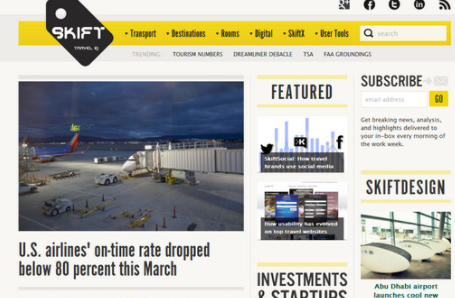 Skift:旅游行业热点新闻网是一个报道与旅游行业相关的酒店信息、航空信息的新闻资讯,由PaidContent的创始人Rafat Ali创立,目的是把一系列相关的新闻、观点、数据以及有用的工具提供给旅游从业人员。...