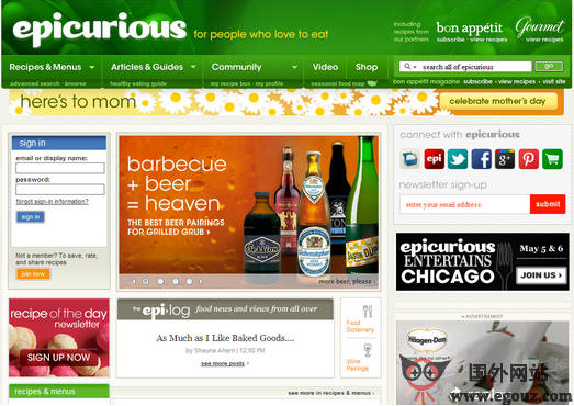 Epicurious:美国美食菜谱门户网是美国著名的美食站点,该国外网站涵盖世界三万多中菜谱,提供美食类文章和最新美食,健康营养讲座,饮食搭配等。Epicurious创办于1995年,网站设有食谱和菜单,文章和指南,社区等栏目,用户可以通过关键词对食谱进行搜索。...