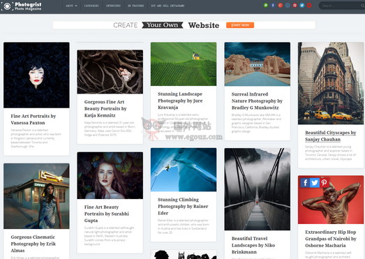 Photogrist 是一个分享摄影作品的站点,这里汇集了来自世界各地的摄影爱好者提交上来的摄影作品,并根据摄影师的作品进行详细的分类,在这里你可以找到丰富的摄影分类栏目,喜欢欣赏摄影...