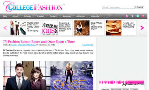 CollegeFashion:大学时尚资讯博客网是一个由大学生创立的,为了那些时尚的大学女孩开设的博客站点,该网站会为那些大学生们提供时尚建议、最新的流行趋势、美容建议、网上购物信息、大学生活反思、大学时尚达人的街头风格,还有一些风格建议等。...