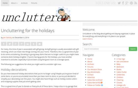 Unclutterer:家庭生活极简主义博客是一个生活类的博客网站,主张生活的极简主义运动,以帮助人们拥有一个干净、整洁的生活方式,由艾琳都伦创办,并且还撰写了一本书《Unclutter》-your life in one week。...