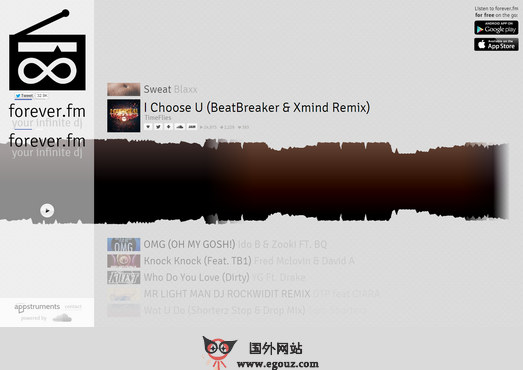 Forever.FM:在线随机音乐电台是一个基于Soundcloud音乐网站的网页电台,该电台设计简单,无花哨的操作界面,音乐与音乐间没有广告,整个网站只有一个播放、暂停按钮,你唯一需要做的就是打开...