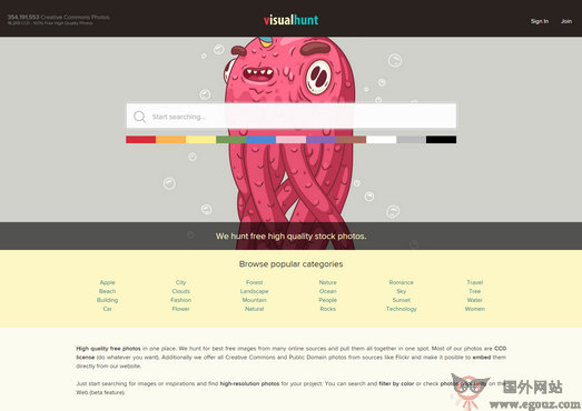 Visual Hunt 网站是一个提供高品质免费图片素材的站点,收录了海量的CC0授权图片整合后生成的站点,用户可以通过内置的搜索引擎来查询海量的免费图片,多少图片来自于Flickr网站。...