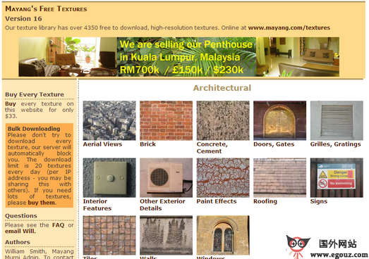MaYang:免费纹理素材下载网是一个提供超过2350个免费纹理素材的网站,所有的素材均可免费下载并应用于商业或者非商业的设计,这些高分辨率纹理素材适用于3d Studio Max, Maya, Blender, Photoshop等软...