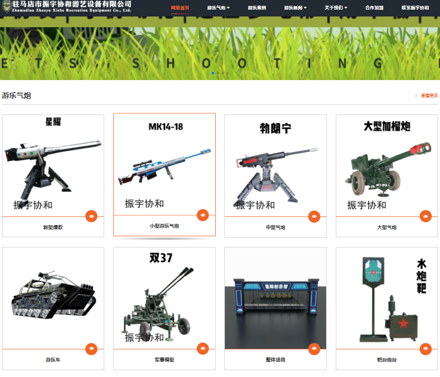 驻马店市振宇协和游艺设备有限公司是一家集气炮枪、射击和游乐场设备、国防教育模型、影视道具研发、生产、销售、运营管理于一体的综合型游乐设备公司。...