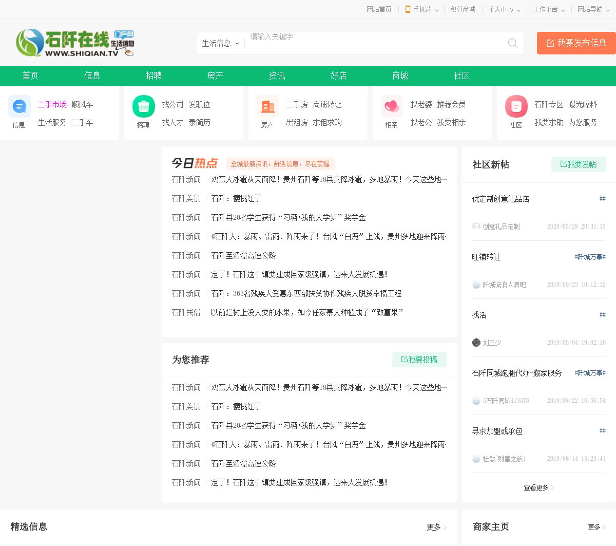 石阡县生活信息门户网站,石阡人自己的电商平台,吃喝娱购一网大打尽,为您提供免费发布信息服务.查询最新最全的房屋出租,石阡房价,二手房,二手车,二手物品交易、求职招聘、石阡生活视点,石阡优惠打折,石阡黄页,石阡供求信息,石阡家居装修,石阡购物,石阡口碑店铺等石阡生活信息,尽在石阡生活网shiqian.tv