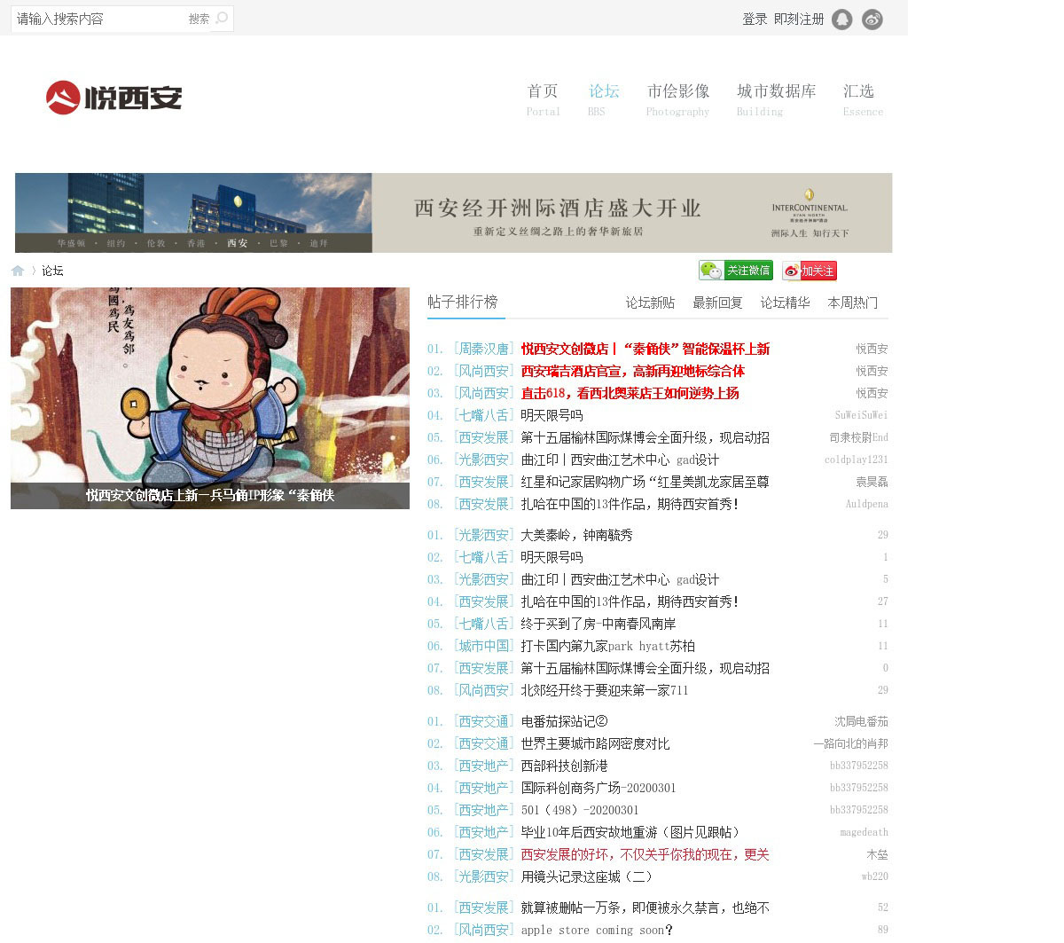 悦西安论坛是西安最火爆的公益性论坛.精彩不断的西安发展爆料,西安摩天建筑大全,西安的高楼建筑进度跟踪,西安购物中心项目招商,西安商业地产,酒店进驻内容及西安交通发展使悦西安论坛成为白领精英的交流论坛.悦西安还包含西安地铁,西安摄影,西安新闻,西安美食攻略,西安旅游等论坛版块,感受未来,西安荣耀.