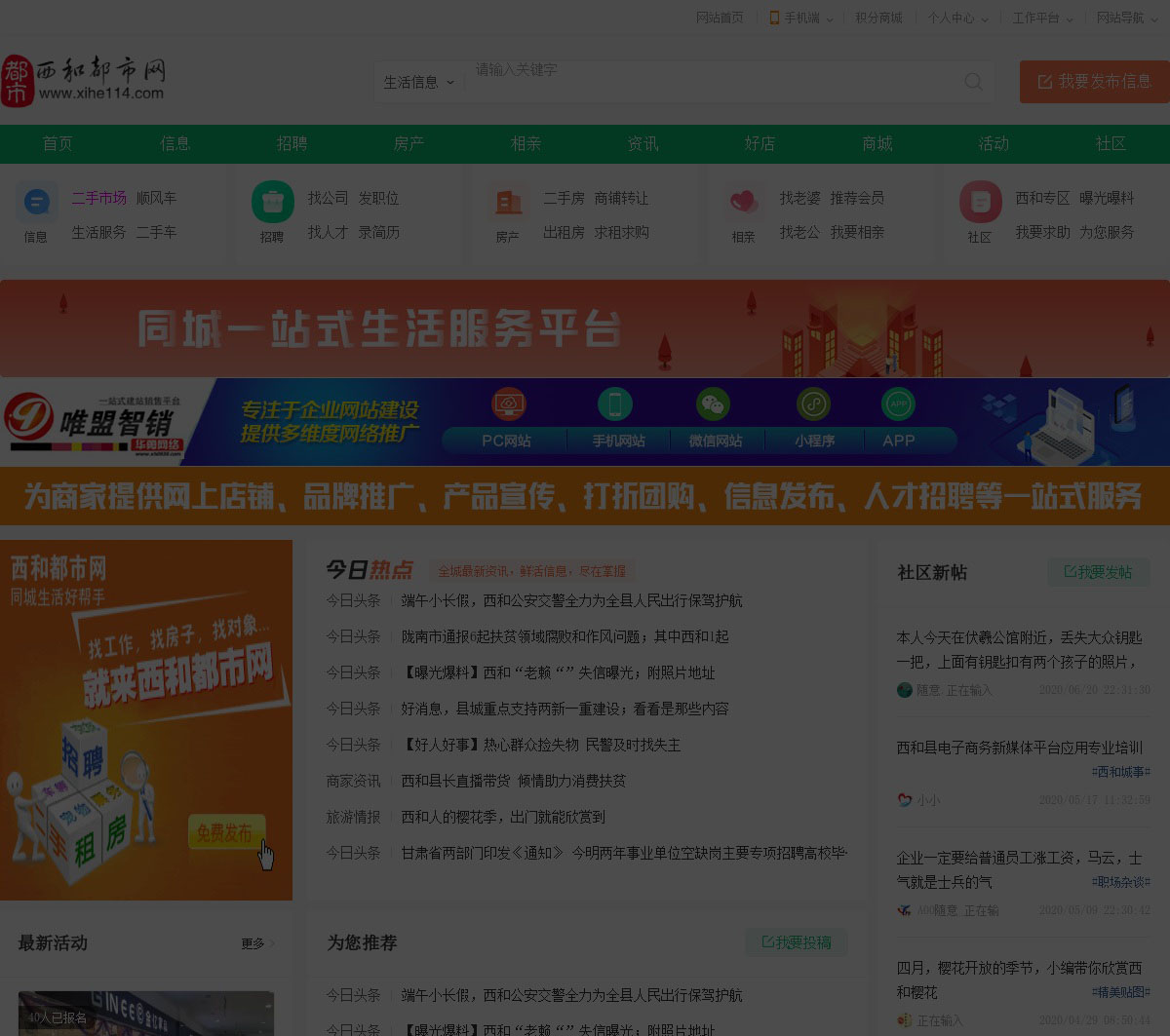 西和都市网是甘肃陇南市西和县综合门户网站,网站内容有分类信息、商家平台、房产信息、论坛贴吧、热点资讯、同城商圈、在线商城、求职招聘、婚礼交友、等一站式信息服务平台