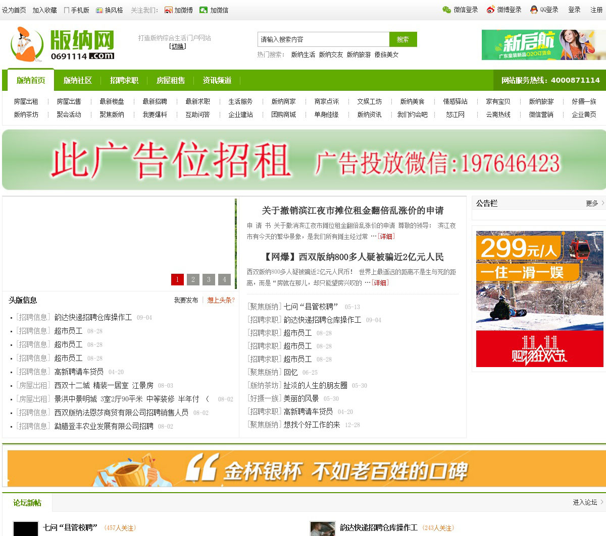 版纳网 是版纳综合生活门户网站,也是版纳网民上网的入口,是免 费发布版纳求职,版纳招聘,版纳房产,版纳建材,版纳装修,版纳汽车,版纳 婚庆,版纳交友,版纳二手等各类信息的首选平台,版纳热线为商家和企业提 供高端网站建设、网站优化、品牌策划推广等一站式网络营销服务!