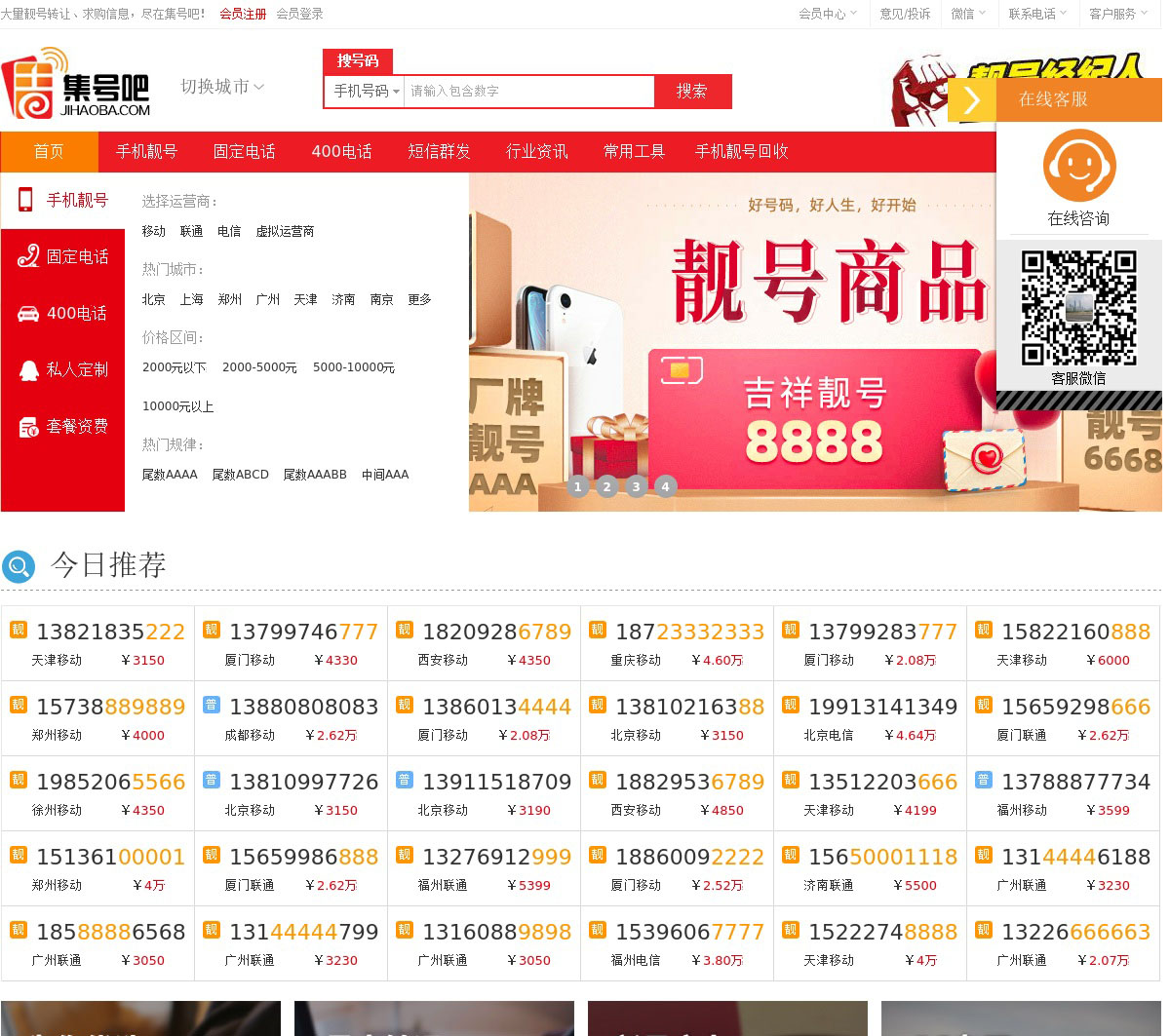 买手机号码、卖手机号码,想办手机卡就上集号吧!手机靓号文化网站!提供各地手机号码大全,移动靓号、联通靓号、电信号码网上选号,最新套餐资费介绍,还有更多固话座机号、车牌号、新能源车 牌、400电话、电话号码等你来拿,集号吧号码网为卖家提供号码发布、靓号店铺等服务,打造号码行业电子商务平台