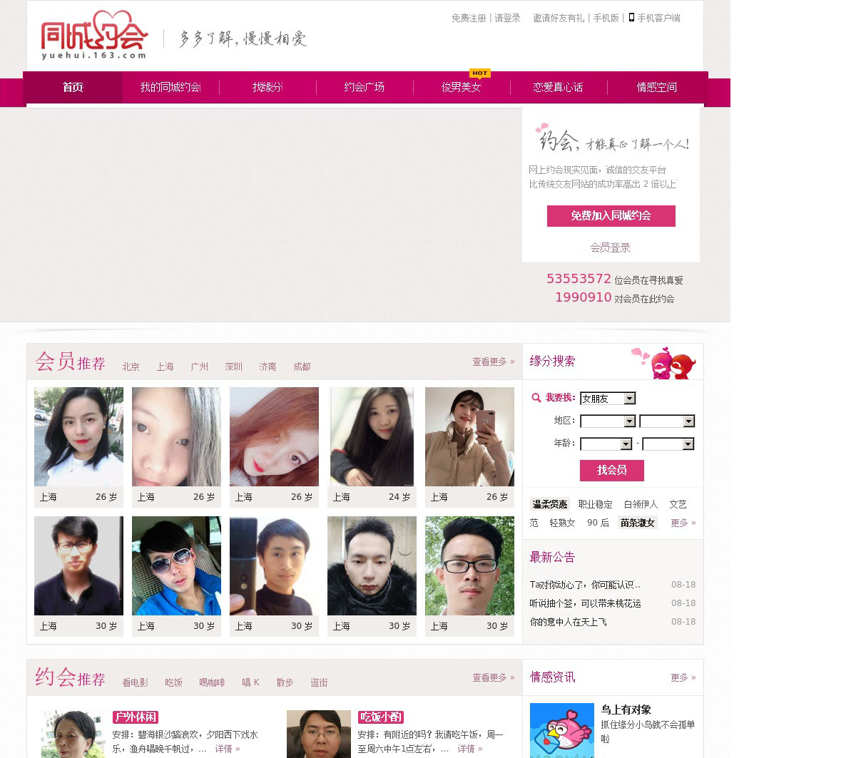 同城约会是网易公司旗下婚恋交友网站,专为单身男女白领提供征婚交友服务,免费发布约会促成同城交友,坚持诚信相亲,谢绝。同城约会提倡多多了解,慢慢相爱,是一个绿色的网友见面的相约平台。