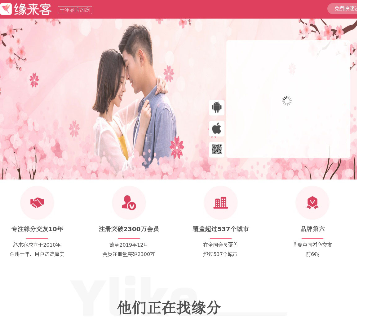 缘来客交友网是拥有多年口碑的大型同城约会交友网站,专为同城男女交友提供同城约会平台,免费注册,诚信安全;缘来客交友网拥有万同城交友会员,其中%为白领人士,是都市男女同城约会、同城交友的地。