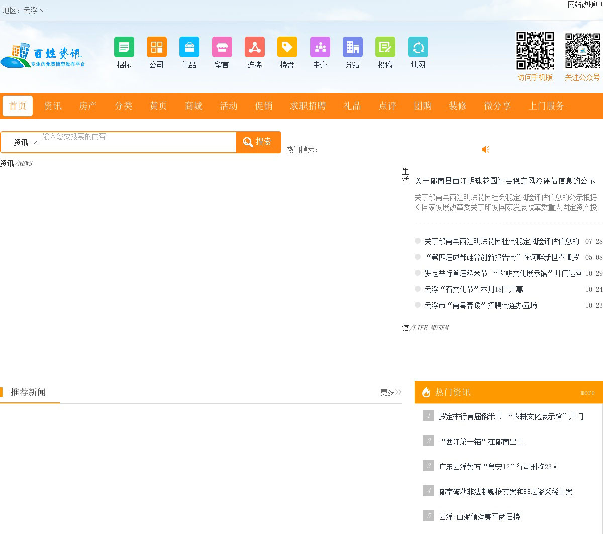 云浮百姓资讯网以服务本地百姓生活、经济发展,及时向百姓传送各类新闻资讯、房产、楼盘、分类信息、购物、商家、黄页、团购、活动、优惠、促销、求职、招聘、美食、汽车、旅游、点评、二手信息等一系列的生活资讯,以及百姓心声、企业资讯等最好的地方门户服务的平台。