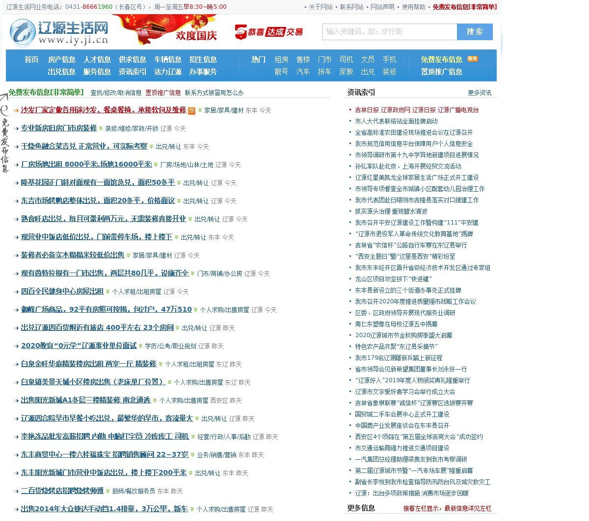 辽源生活网(辽源信息港),吉林辽源生活信息港。栏目设置:房产、人才、供求、车辆、招生、出兑、服务、资讯