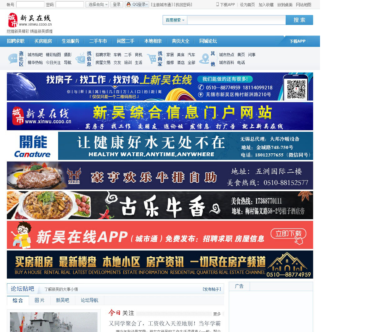新吴在线,汇集新吴城市资讯,社区论坛,人才招聘,房产交易,打折促销,电话黄页等综合信息。新吴人自己的网上家园,尽在新吴在线www.xinwu.ccoo.cn/