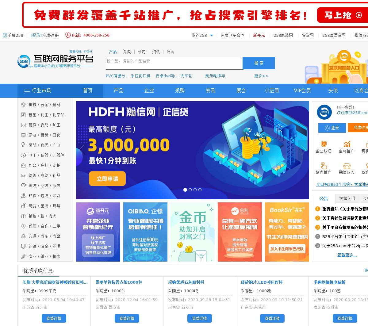 258.com是互联网+一站式企业服务平台,提供B2B行业海量的行业资讯、供应信息、求购信息和公司黄页信息等,并免费为中小企业提供互联网转型产品应用市场,帮助企业免费网络推广、网络营销、互联网金融服务等,是企业互联网化转型的一站式服务平台。