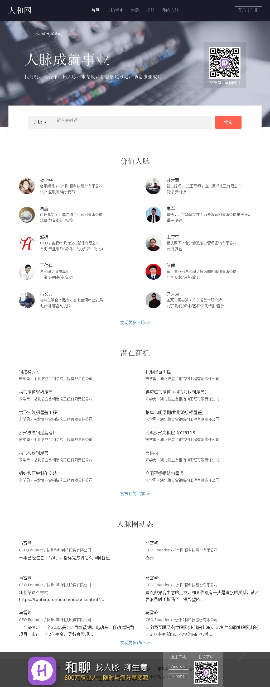人和网是中国优秀的人脉拓展平台,在这里您不仅可以认识各行业的高端人脉,更可以通过人脉寻找各种投资和靠谱项目,推广您的产品或服务,寻找更好的职位,找到优秀人才!