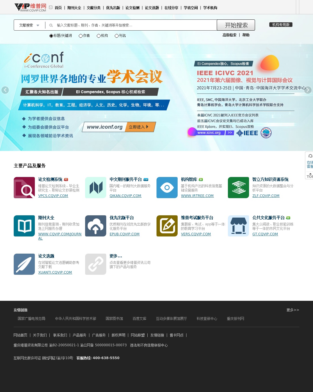 维普官方网站-国内大型中文期刊文献服务平台,提供各类学术论文、各类范文、中小学课件、教学资料等文献下载。网站主营业务包括论文检测服务、优先出版服务、论文选题下载,在线分享下载等。