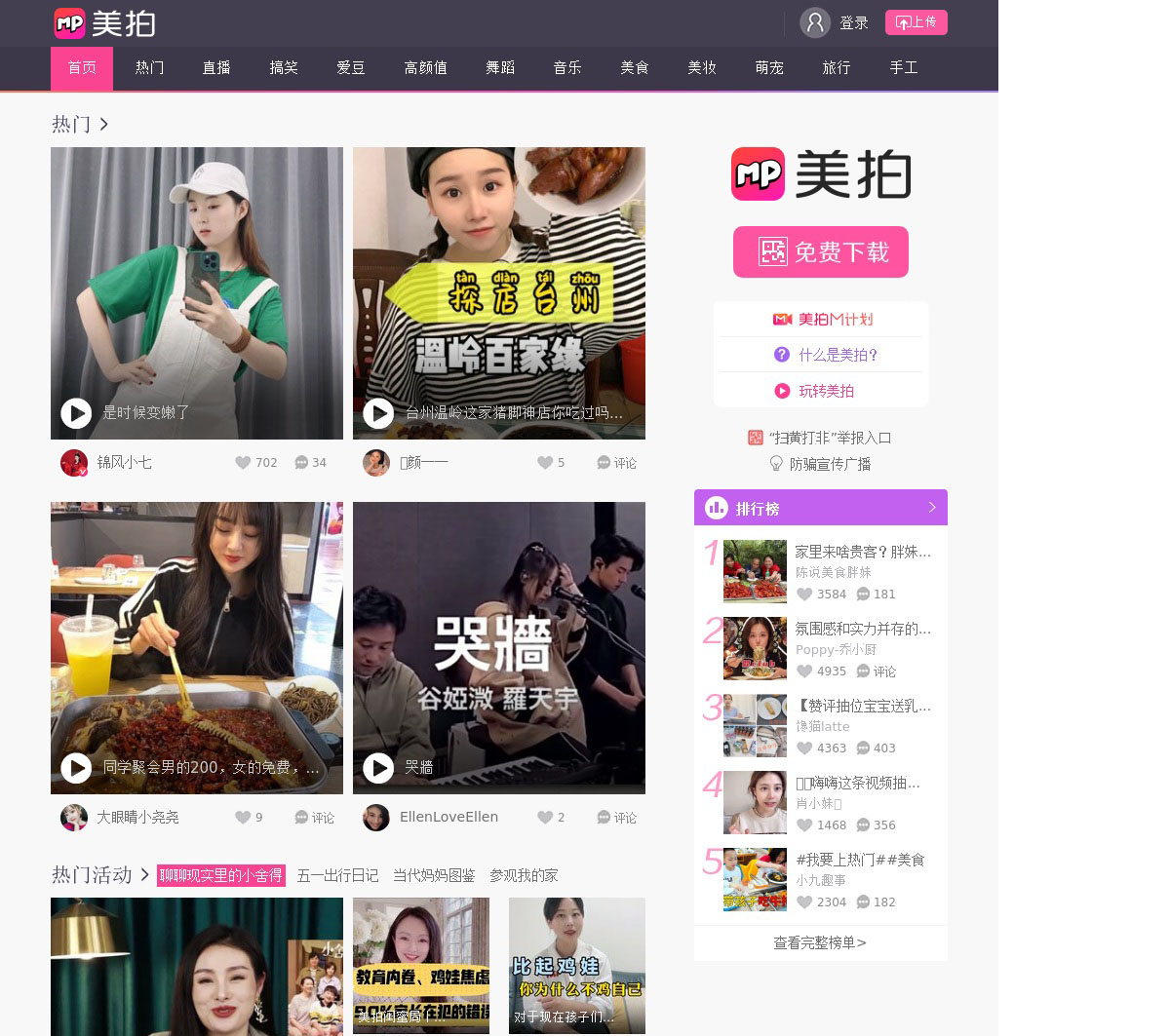 美拍网页版精选了热门、明星、搞笑逗比、女神男神、音乐舞蹈、时尚美妆、美食创意、宝宝萌宠等好玩有趣的短视频!