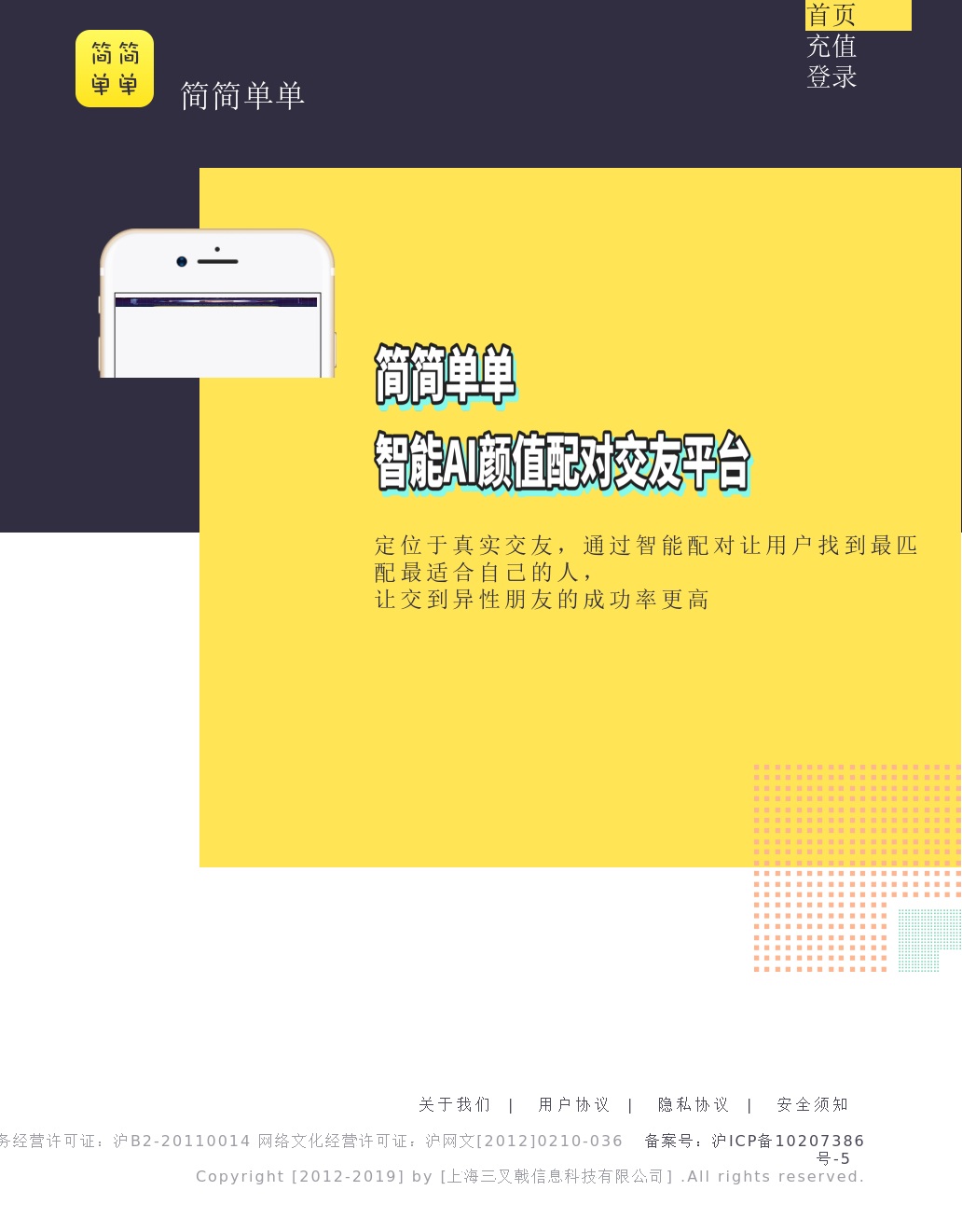 | 上海三叉戟信息科技有限公司 | 企业 | 沪ICP备10207386号 | 简简单单交友 |