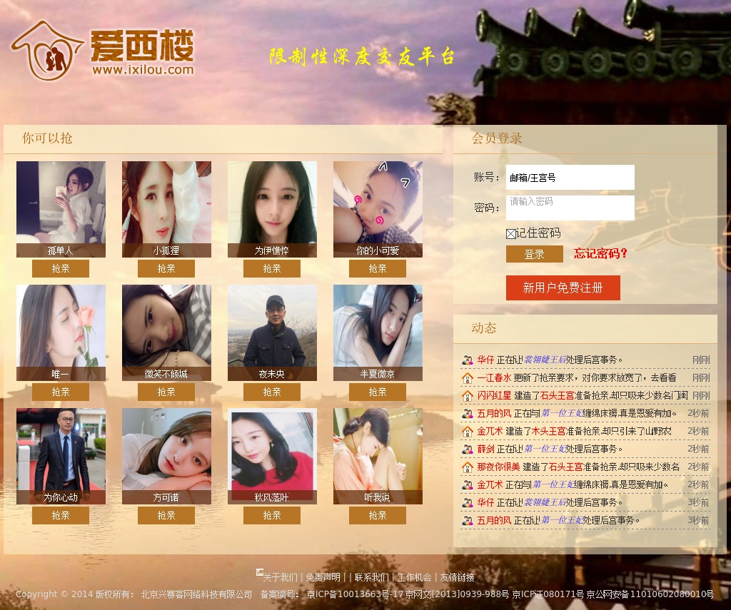 爱西楼(ixilou.com)是国内最专业体验古代宫廷婚姻生活的同城交友网站,能够为千万优质单身会员,提供模拟古代宫廷婚姻生活的网上交友体验,爱西楼交友网致力于让寂寞的人穿越在爱西楼王宫中结识知己,爱西楼圆您后宫佳丽三千这个梦!