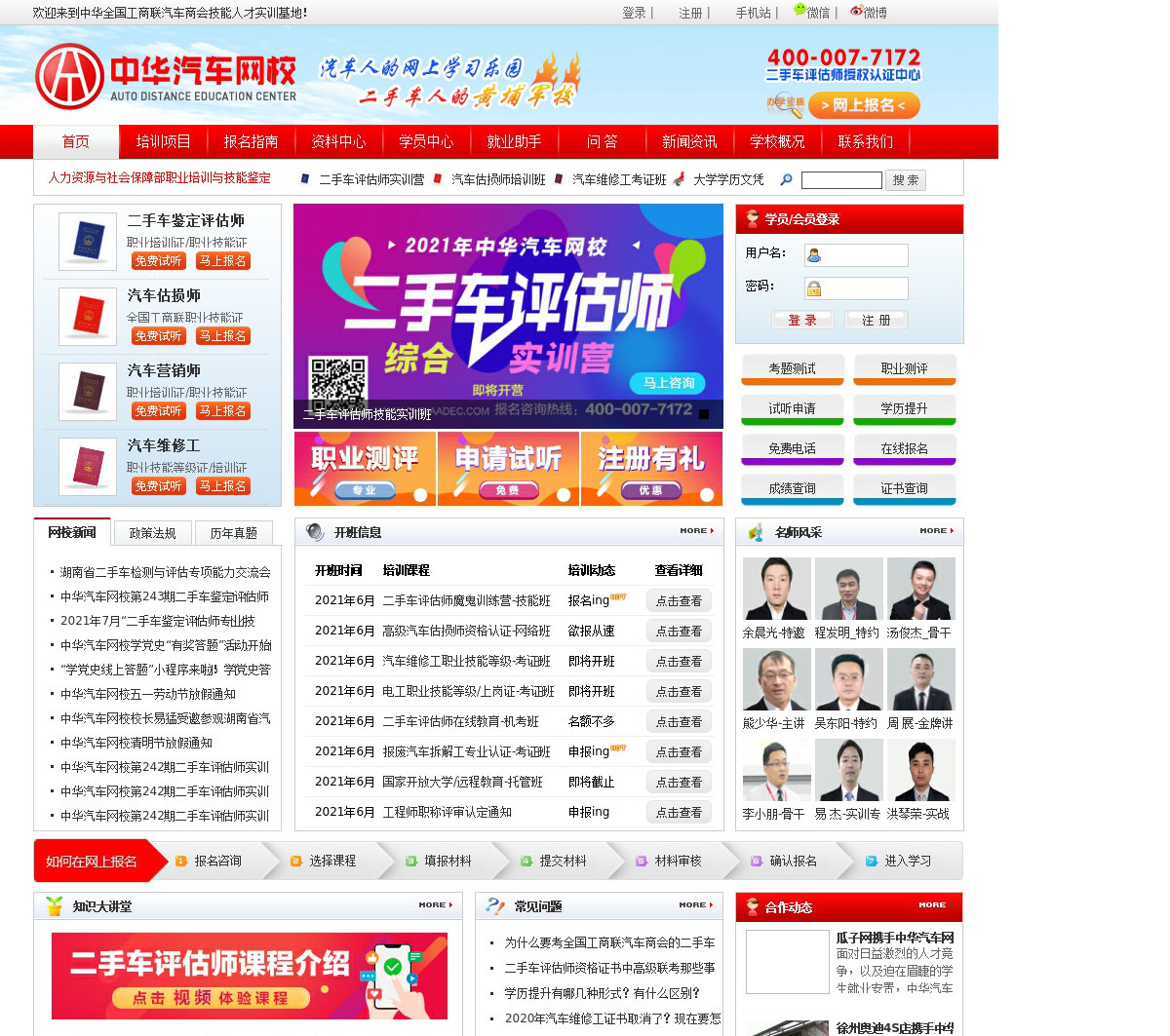中华汽车网校是国家许可办学的职业培训学校,是汽车后市场网络教学典范,专业从事二手车评估师、二手车经纪人、汽车估损师、汽车销售顾问、汽车修理工、电工、焊工、机动车鉴定评估师、二手车鉴定评估师、二手车检测与评估、二手车整备工、汽车评估师、汽车营销师、农机修理工、维修电工、新能源汽车维修师、安全评价师等职业技能培训与资格证书考试,并提供高起专/专升本学历提升服务,学校教学实力雄厚,培训效果卓越。