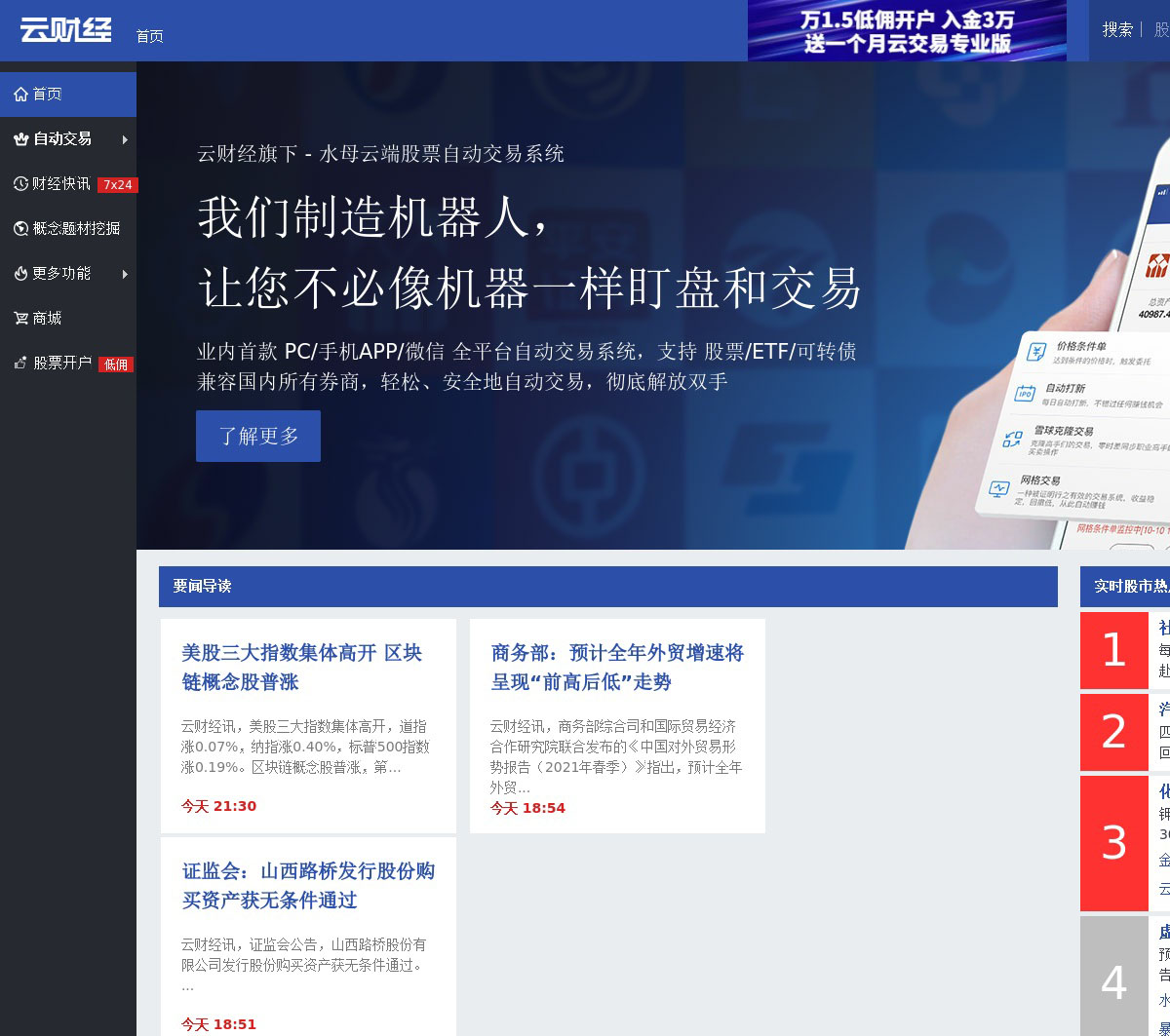云财经是专业的股市行情、资讯聚合、自动交易平台,汇聚全网最新股票内参和热点题材,独创多种资金指标,更有股票全自动交易模块,助力实现量化交易。把握今日股市行情,就上云财经!