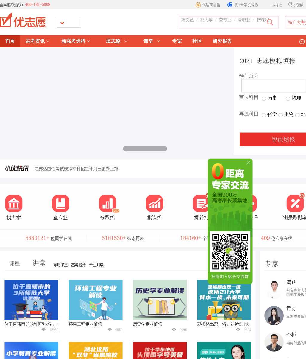 优志愿高考志愿填报模拟平台,为高考生提供新高考选科和高考志愿填报技巧,输入高考分推荐适合的大学和专业,帮助高考生解决高考志愿填报难题。