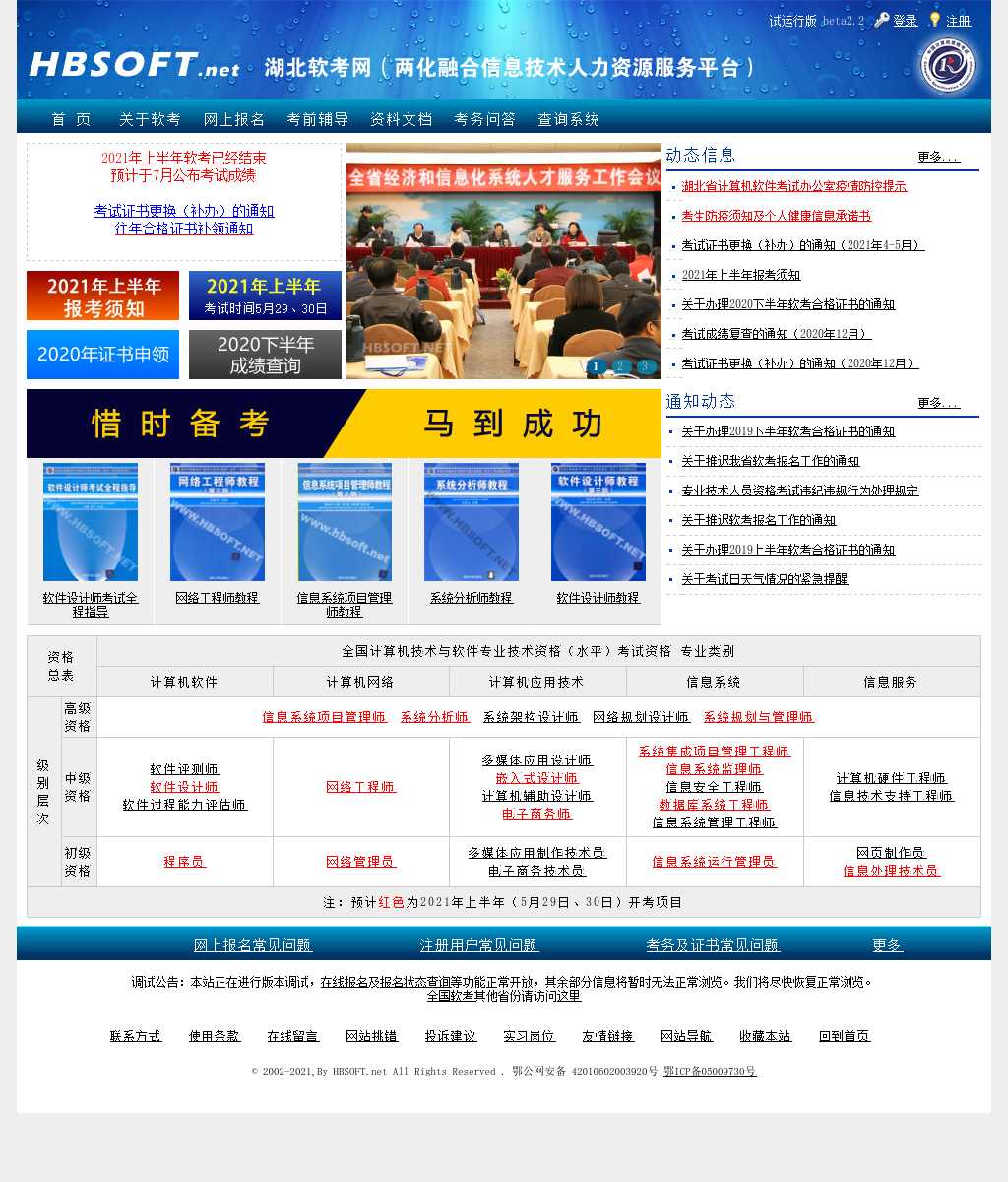 软考报名与查分的官方网站。提供在线报名、分数查询、教材订购、培训信息。湖北站绝大多数信息适用全国考生。2021年上半年考试时间预计为5月。