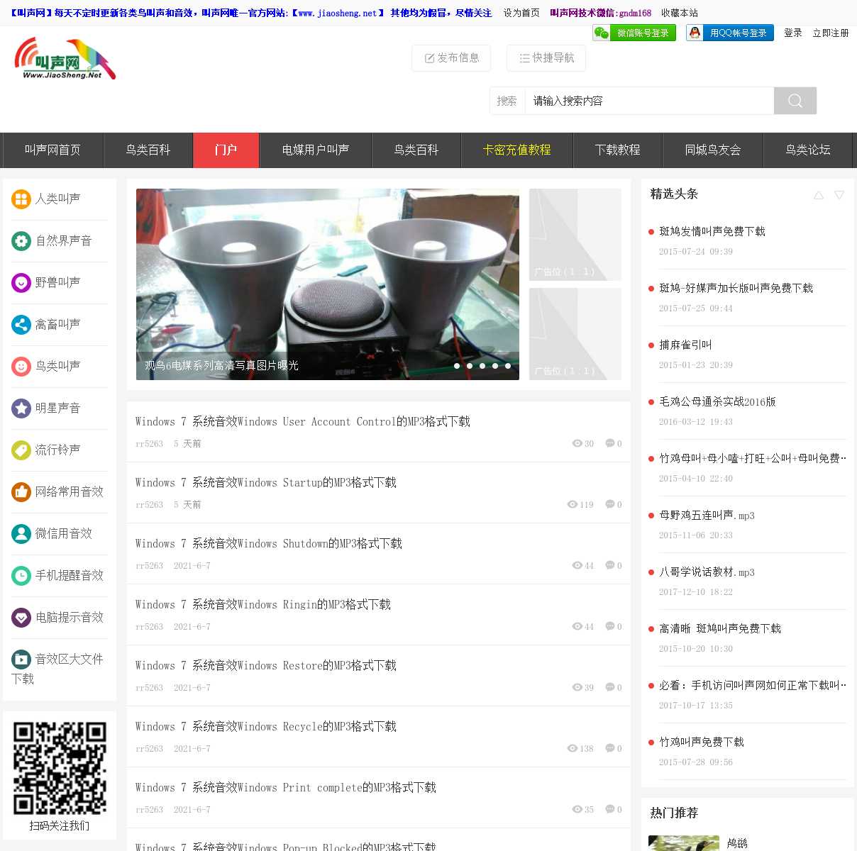 叫声网是一个专业收集各类声音的网站,开设有鸟叫声大全在线试听和下载,各类宠物驯养视频和综合声音交流论坛,欢迎喜欢下载和分享各类声音和叫声的朋友进来分享您的快乐,叫声网有你参与更精彩!摄影拍摄用的画眉鸟叫声下载,鸟叫声大全,画眉鸟,鹩哥,八哥,云雀,鹦鹉,毛鸡,竹鸡,斑鸠,鹧鸪,鹌鹑,白面水鸡,黑水鸡,叫床声等几百种mp3鸟叫声,打造鸟声网的鸟类大全