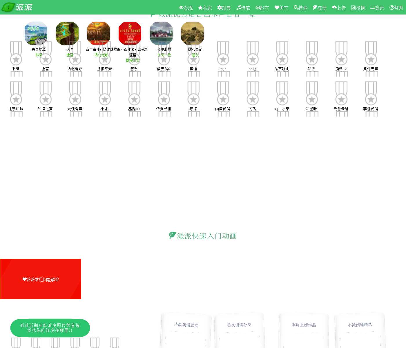 派派是国内知名的朗诵、朗读、配音专业有声语言平台,在派派,你可以结识到专业的朗诵者、知名的原创文字作者、倾听到海量的有声语言艺术作品!